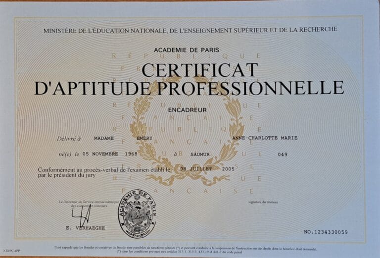 Une passion qui a voyagé avec moi. Ma vie personnelle m’a amenée à déménager souvent, et l’encadrement est devenu mon fil conducteur. D’élève passionnée, je suis devenue professeure au gré de mes installations, transmettant ce savoir-faire à mon tour. En 2005, j’ai ancré cette pratique dans une exigence professionnelle en obtenant mon CAP d’encadrement d’art, avant de me former pendant 5 ans à la dorure à la feuille dans un atelier parisien.